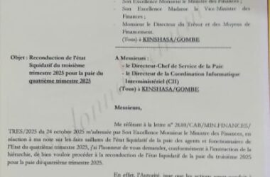Kinshasa, Octobre 2025 Publiez tel qu’on me l’a envoyé Un document officiel du Ministère des Finances, qui a fuité et fait l’objet d’une analyse, lève le voile sur un dysfonctionnement